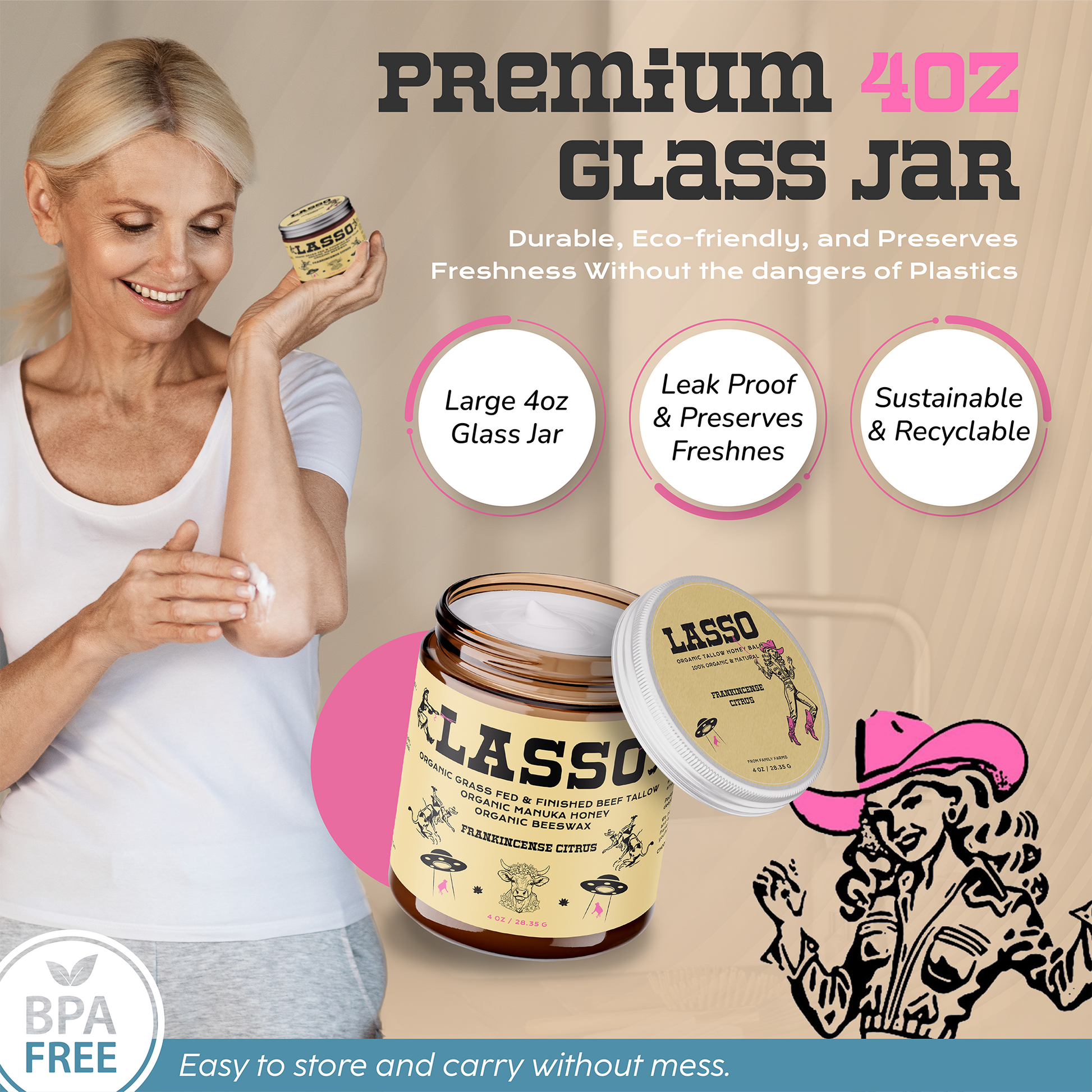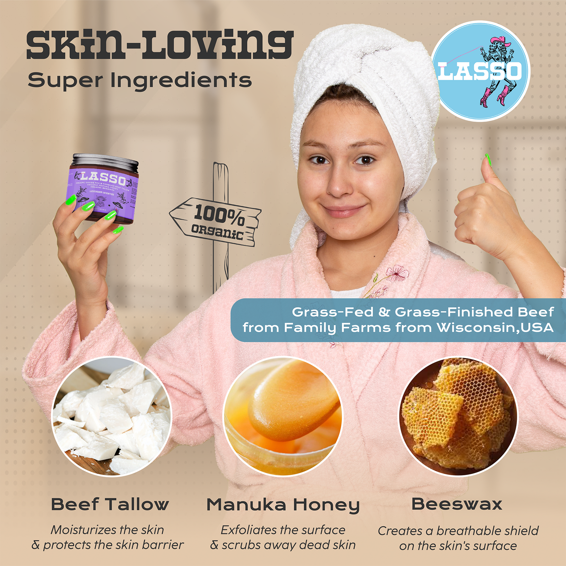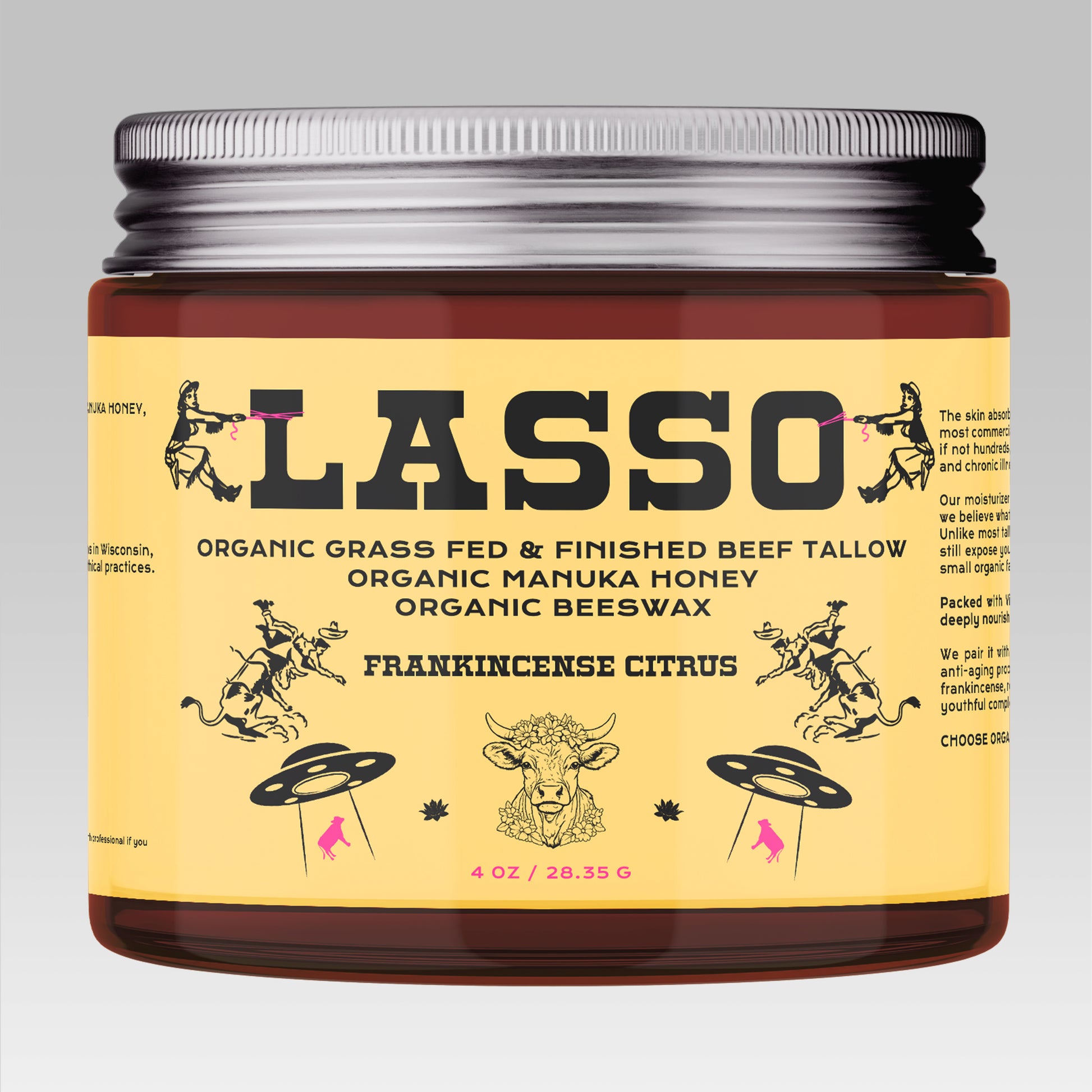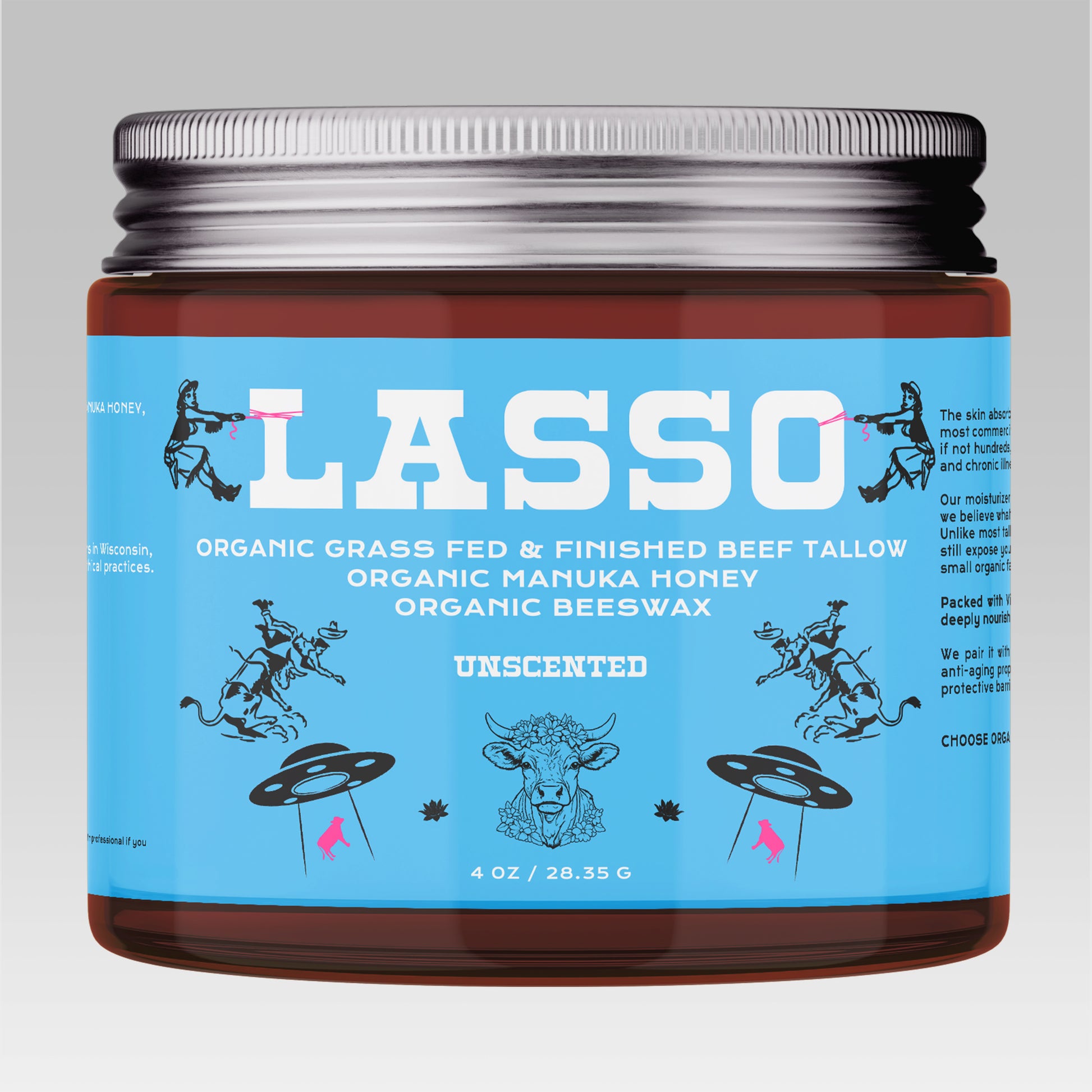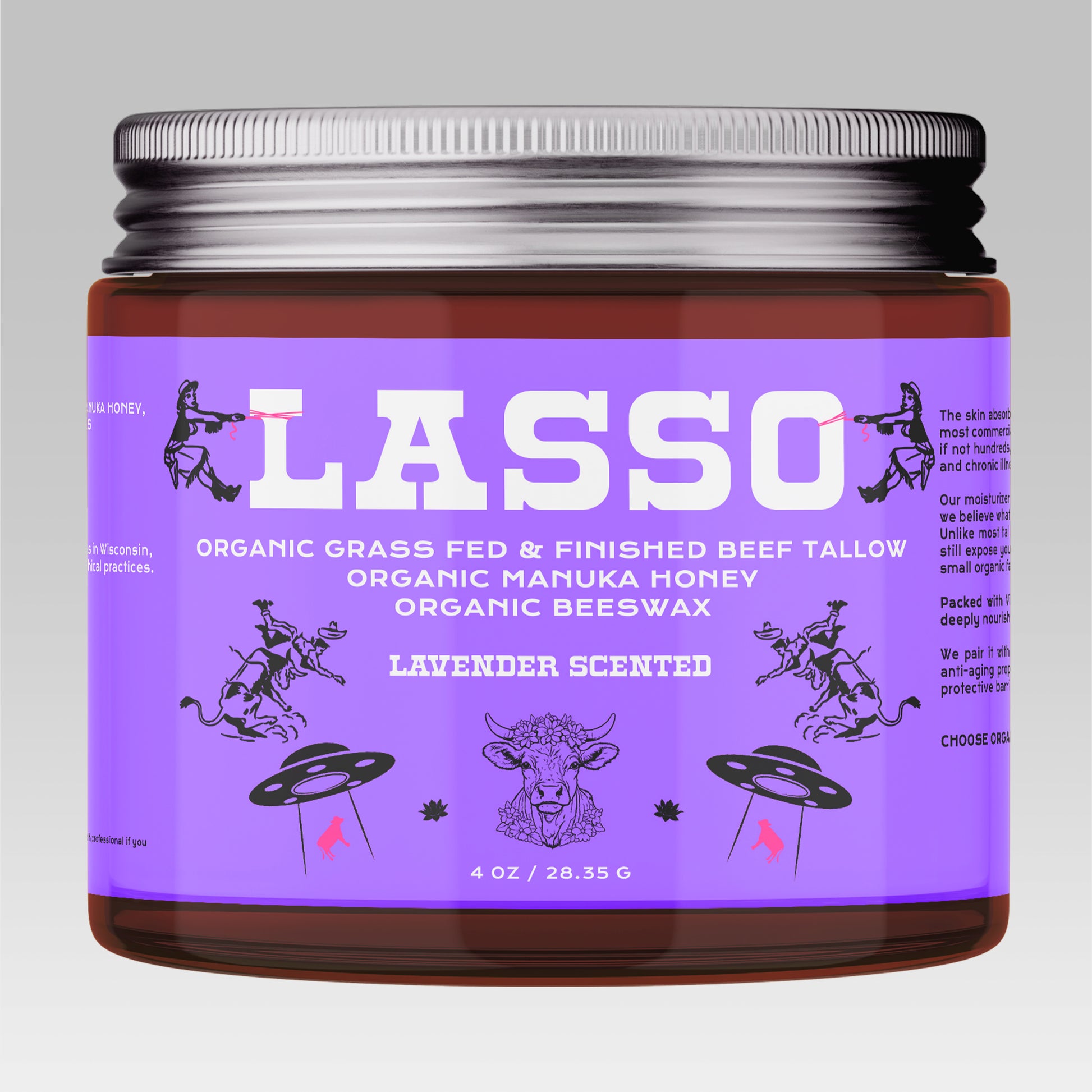 Lasso Balm is made from 100% grass-fed & finished beef tallow, organic manuka honey, and organic beeswax — with no fillers, fragrances, or preservatives.